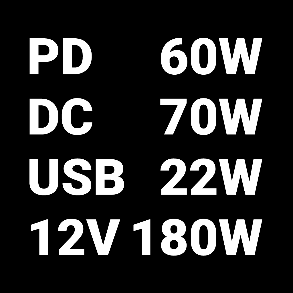 • USB-C PD output 1: 5V/3A, 9V/3A, 12V/3A, 15V/3A, 20V/3A (60W max)