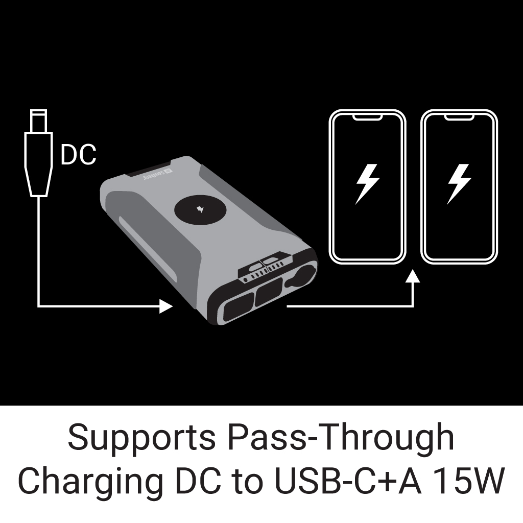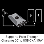 • Supports Pass-Through Charging: Yes. While DC is input, USB-C2 & USB-A can do output at the same time (15W max per port).